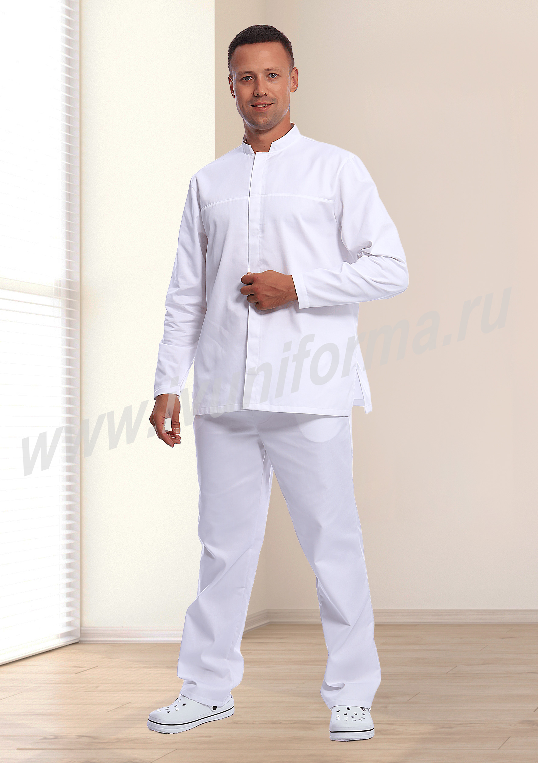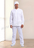 Костюм мужской состоит из куртки и брюк. Куртка удлиненная прямого силуэта с центральной потайной супатной застежкой на кнопки. Полочки с отрезными кокетками, спинка со средним швом. Рукав втачной длинный, прилегание рукава по низу регулируется кнопками. Воротник-стойка обеспечивает изоляцию кожных покровов в области шеи. В боковых швах куртки предусмотрены разрезы для легкого доступа в карманы брюк. Брюки прямые на эластичном поясе с верхними боковыми карманами с наклонным входом. Костюм предназначен для защиты от общих производственных загрязнений. Модель разработана в соответствии с международными требованиями безопасности пищевого производства согласно системе НАССР (ХАССП).